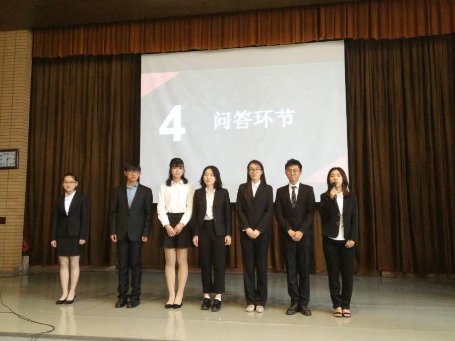 演讲结束,就到了第四项问答环节。各位竞选人站到台前回答各位老师和同学的提问。员工会主席提出有关“面试活动中怎样判断面试者在未来的工作态度”问题;钱梦婷老师询问了各位的优势劣势;周鑫宇老师请竞选者就“员工会应该满足员工需要”、“员工会需要资金支持”两个观点发表自己的看法。竞选者踊跃发言,从不同方面阐述了自己的思考和主张,做出了精彩的回答。
