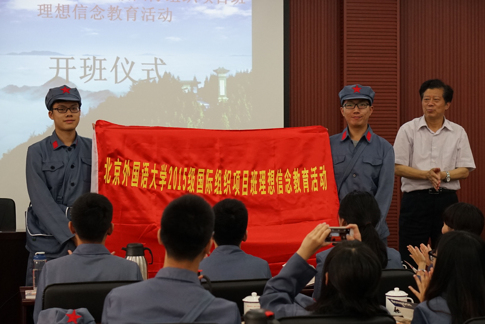 第一天抵达井冈山之后,项目班同学集体换上红军服,在教学基地会议室举行奏国歌、授班旗仪式。中国井冈山干部公司特聘教授、井冈山革命博物馆馆长谢善广受邀进行了题为《井冈山斗争与井冈山精神》的专题讲座,生动具体地讲解了井冈山斗争、红四军两破“进剿”、分田运动、黄洋界保卫战等红色革命历史,为项目班同学了解井冈山历史文化奠定了坚实基础。