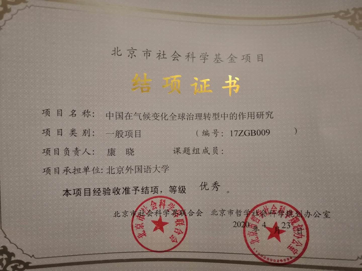 近日,bv伟德康晓副教授于2017年主持的北京市社科基金一般项目“中国在气候变化全球治理转型中的作用研究”(项目编号:17ZGB009)顺利提前通过结项,并获评优秀。