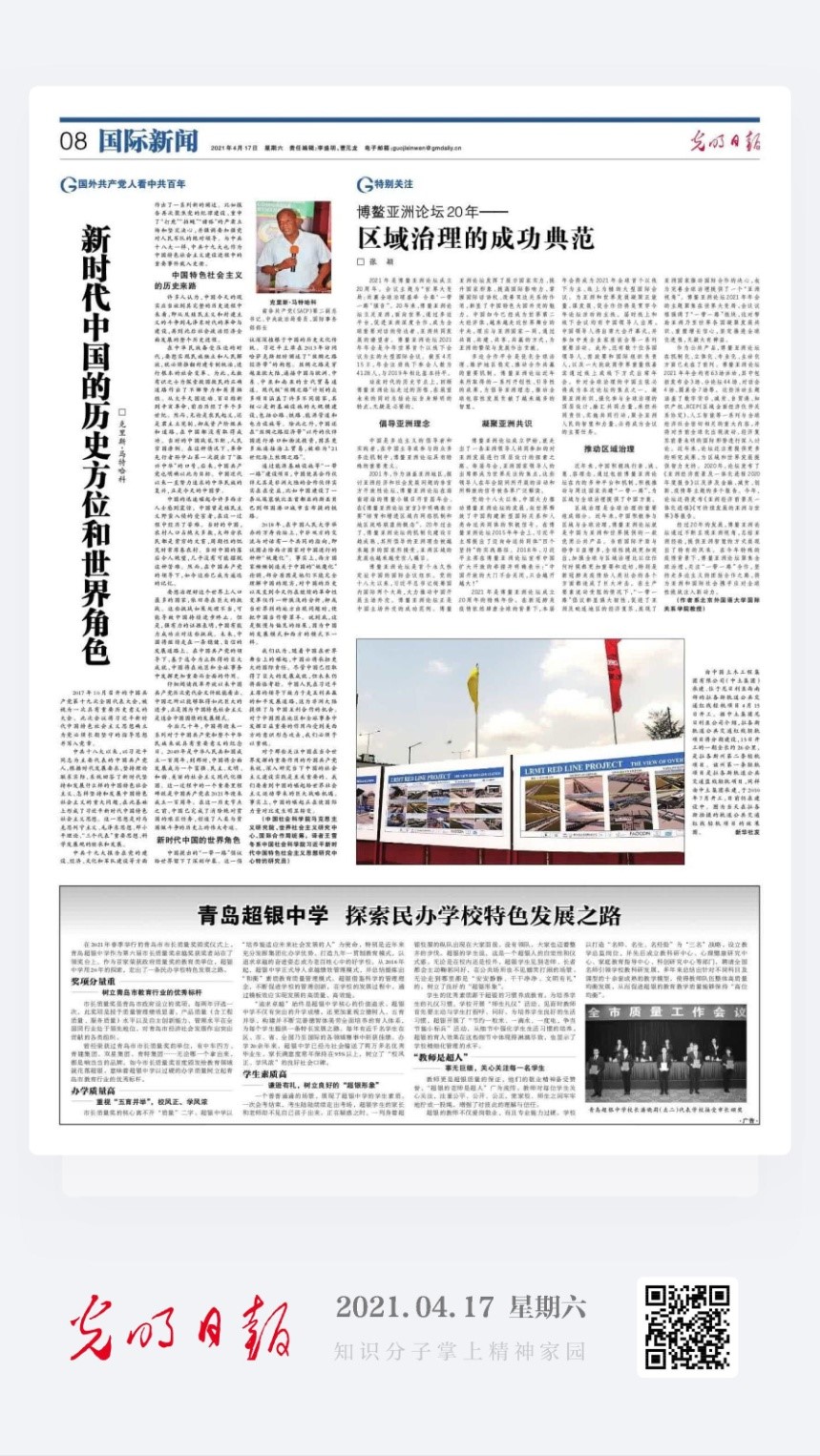 在博鳌亚洲论坛即将召开之际,公司bv伟德张颖教授在《光明日报》发表署名文章。该文从区域治理的角度解读了博鳌亚洲论坛二十年发展历程,展望了博鳌亚洲论坛未来发展方向。该文是《光明日报》为博鳌亚洲论坛2021年年会预热的系列文章之一,受到广泛关注。