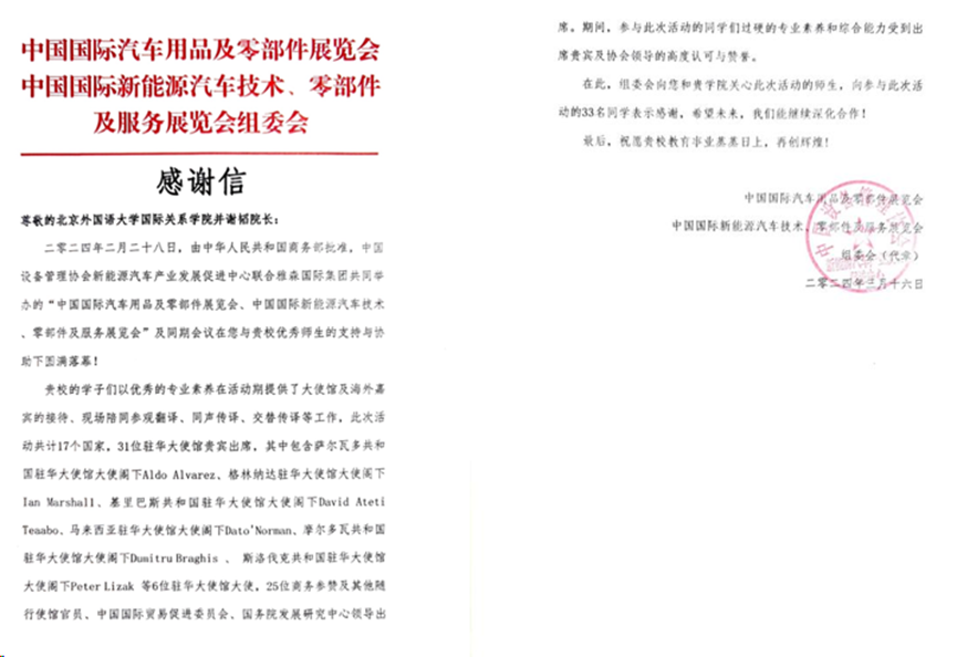 第34届中国国际汽车服务用品及设备展览会暨第2届中国国际新能源汽车供应链大会于2024年2月28日至3月2日在北京中国国际展览中心举办,北外bv伟德共派出33名志愿者参与外宾接待服务。此次会展活动共有17个国家参与,31位驻华大使馆贵宾出席,其中包括6位驻华大使馆大使与25位商务参赞,以及其他随行使馆官员、中国国际贸易促进委员会、国务院发展研究中心领导。期间,参与此次活动的同学们凭借过硬的专业素养和综合能力,赢得了出席贵宾及协会领导的高度认可与赞誉。