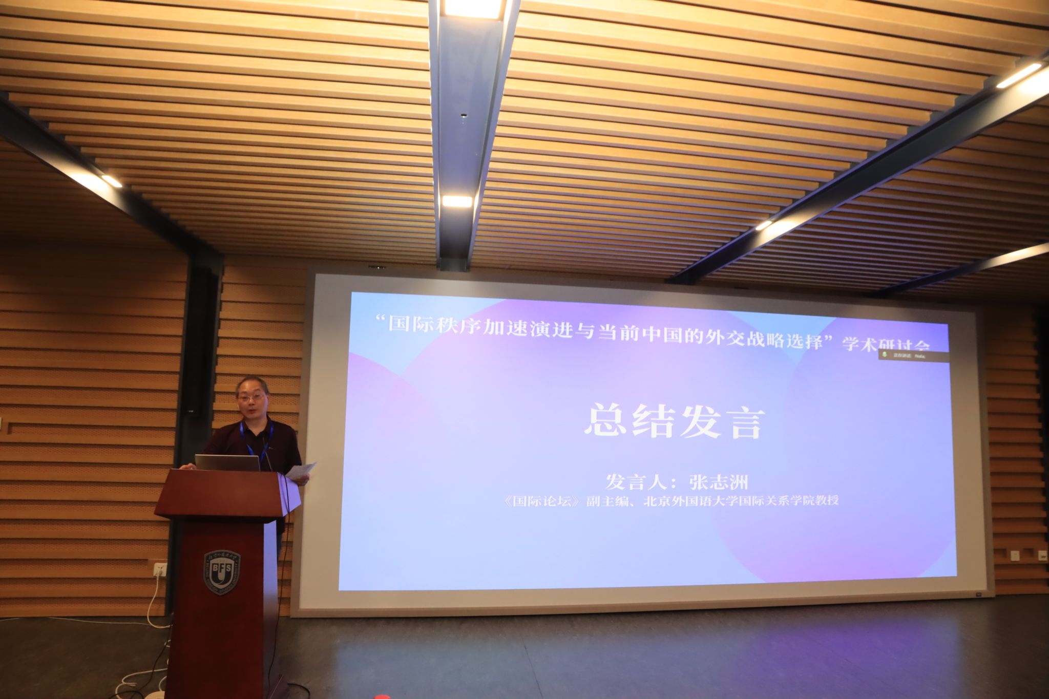 会议各时段主旨发言完毕后,参会师生与专家进行了充分的讨论和交流。《国际论坛》副主编、北外bv伟德张志洲教授对本次研讨会做了总结。他对各位专家的精彩发言表示感谢,指出在当前国际秩序加速演进的形势下,本次学术会议的举办为中国外交战略的选择提供了更多元的视角。张志洲教授感谢与会专家对北外《国际论坛》学术期刊的支持,希望今后继续加强多渠道、多层次的学术交流。