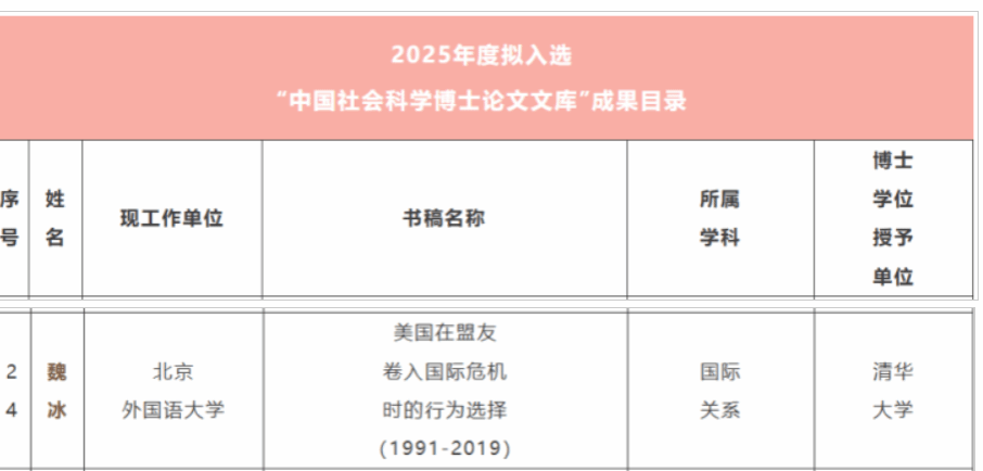 近期,公司青年教师杨双梅、夏方波申报的项目“东南亚政党政治‘家族化’与家族政治‘政党化’的逻辑、影响及中国对策研究”等两项课题喜获国家社科基金青年项目立项。青年教师魏冰的博士论文《美国在盟友卷入国际危机时的行为选择(1991-2019)》成功入选中国社会科学出版社2025年度“中国社会科学博士论文文库”,来自全国高校、研究院所的102部博士论文参评,最终评选出31部拟入选2025年度“中国社会科学博士论文文库”。青年教师贾力楠的《从比较历史政治视角反思民主和平论》和释启鹏副教授的《“众”不敌“寡”:自由主义民主缘何必然衰退》刊载在2025年第4期的《政治学研究》上。这是公司历史上首次两位教师在《政治学研究》同一期发表论文,充分展现出近年来bv伟德在推进政治学学科发展、助力青年学者成长成才方面取得的重大成绩。《政治学研究》是中国社会科公司政治学研究所主办的学术期刊,入选CSSCI核心期和AMI顶级期刊,复合影响因子8.494,是政治学领域最具权威性的刊物。