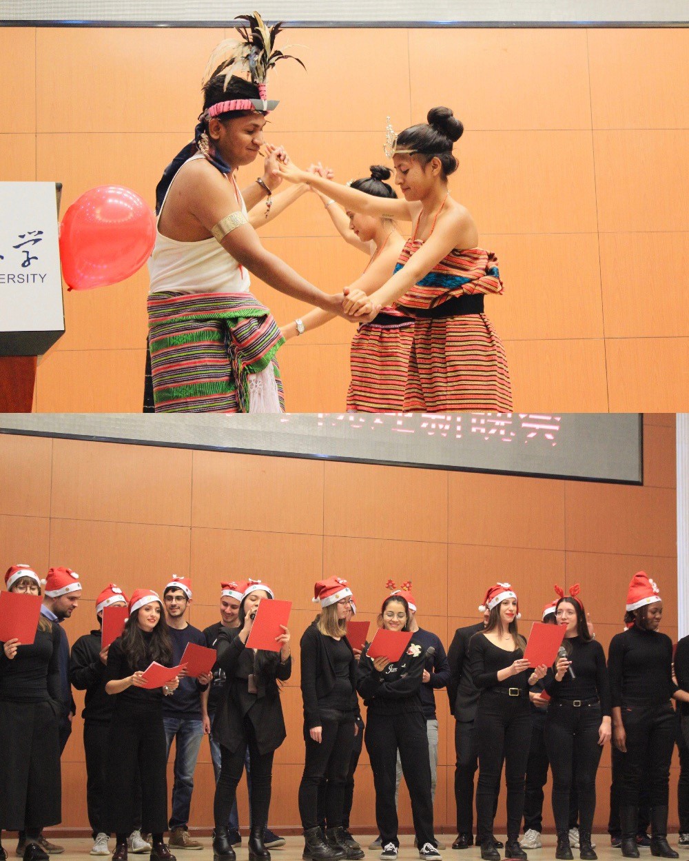 整台晚会综合了各国舞蹈、歌曲、民乐、舞台剧等表演形式。来自蒙古国的研一同学滺滺以一曲《Jingle Bells Rock》拉开了晚会的序幕。紧接着来自美国的卫儒同学为大家带来了诗歌朗诵《Mending Walls》,让观众感受到了诗歌的优美旋律。来自东帝汶的特色舞蹈《Suru boek》将整场晚会带入了高潮,向观众展示了马纳图托舞的魅力。大三毕恒瑞同学的一曲古琴《文王操》让同学们感受到了中国文化的博大精深。意大利同学合唱的《A natalepuoi,Nelbludipinto di blu》展示了意大利的异域风情,提前为观众送上了圣诞祝福;员工自编自演的《北外我们来了》为大家带来了笑语欢声;最后大四同学制作的《我和北外》视频讲述了大家在北外的收获和对未来的期望。