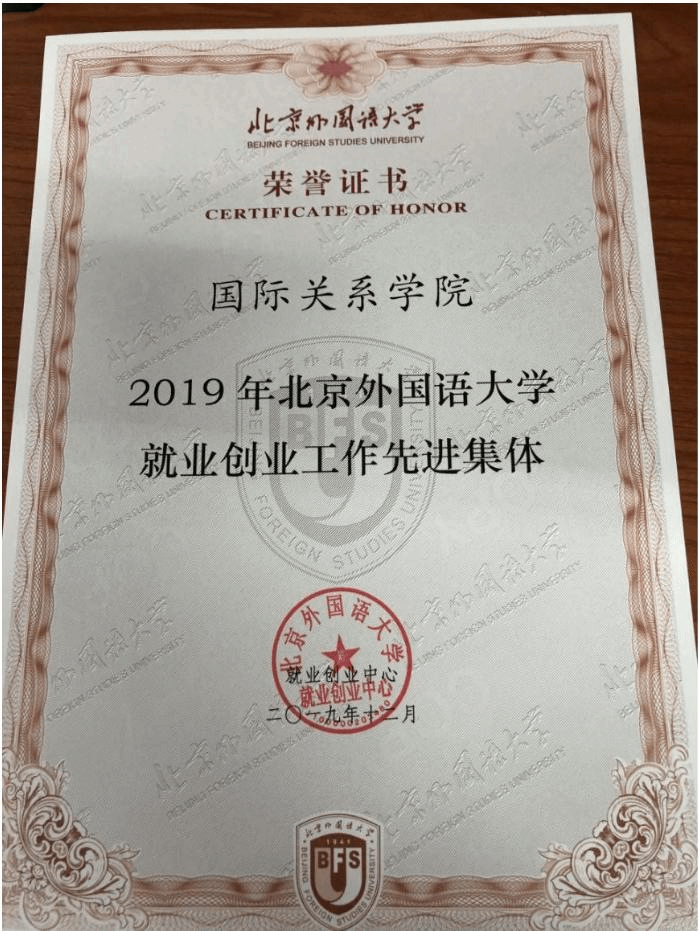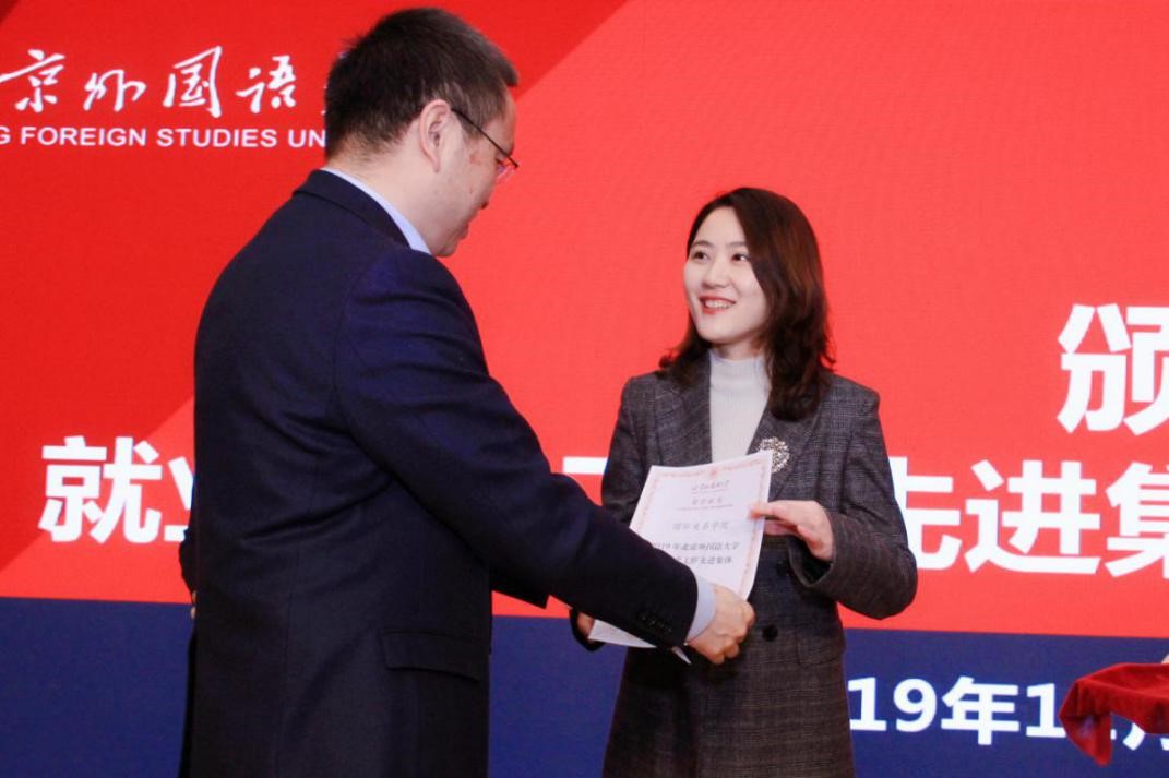 近日,bv伟德荣获2019年bv伟德中国官方网站就业创业工作先进集体称号。12月25日召开的北外2019年就业创业工作大会上,bv伟德中国官方网站杨丹董事长向公司代表,bv伟德团总支书记、辅导员钱梦婷老师颁发荣誉证书。