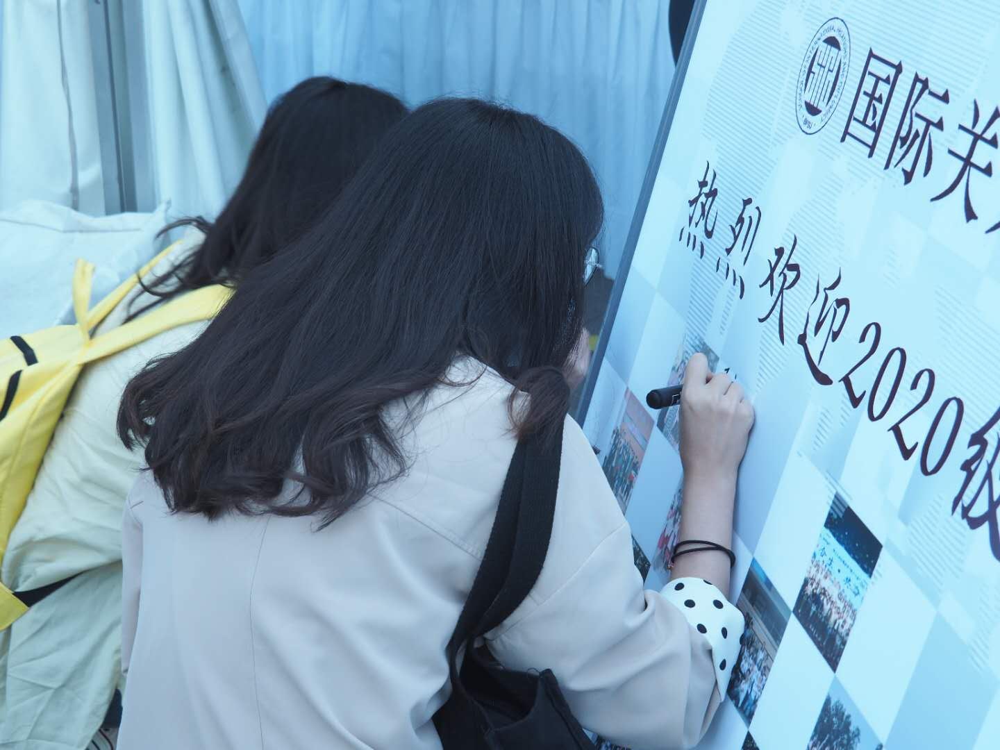 新生们纷纷在签名墙上留下自己的名字,并与之合影,记录与国关相识的那一天。