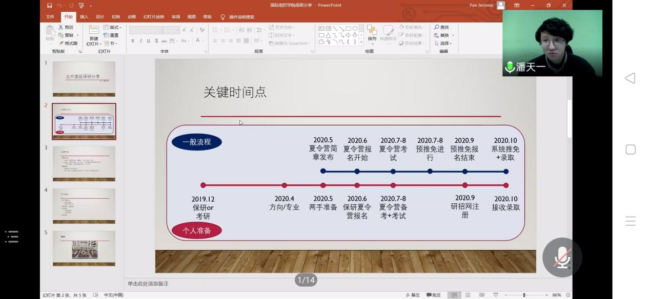 最后,2017级政治学与行政学专业的本科生潘天一同学分享了他的国际组织公司保研经验。他从考研与保研该如何选择讲起,并就几个重要的时间节点所需要准备的材料做了具体讲解。在最后的问答环节中,同学们积极提问,学长学姐们耐心详细地回答了这些问题。此次分享会圆满结束。