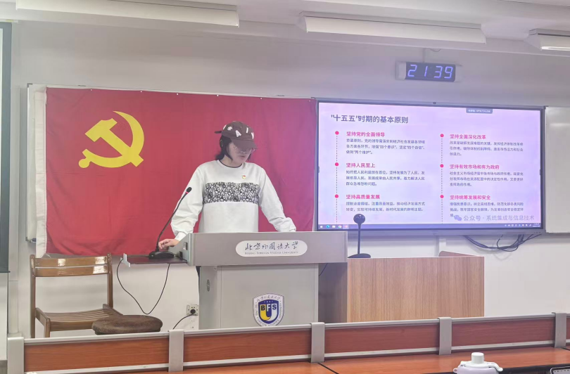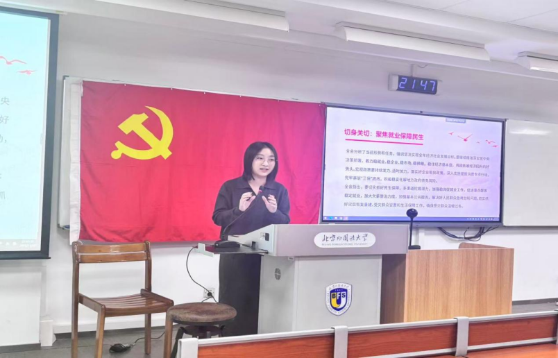 随后,吴柳静同志聚焦《中国共产党第二十届中央委员会第四次全体会议公报》的核心要义,结合个人政策学习体会和社会实践经历,着重对就业保障与维稳工作相关部署安排展开深度解读。她强调,面对当前就业市场的复杂形势,党中央始终把当代青年员工的就业关切放在民生工作的重要位置,主动回应青年群体的就业诉求,并出台一系列精准有效的政策措施加强稳岗促就业工作。她指出,如今各大社交平台上对国内外各类社会议题的讨论日益广泛,这既体现出公众社会参与意识的不断提升和公共责任意识的逐步强化,但同时也需警惕部分不实信息、极端观点的传播带来的负面影响。她呼吁同学们在浏览网络信息时,要保持审慎态度,理性思考判断,共同营造积极健康的社会参与氛围和规范有序的网络空间环境。