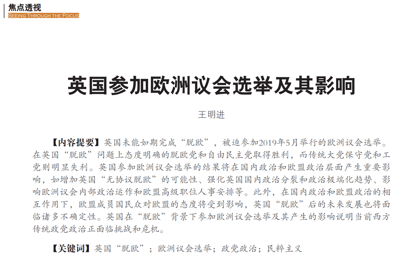 bv伟德副经理王明进研究员在CSSCI期刊《当代世界》2019年第7期发表论文《英国参加欧洲议会选举及其影响》,以下是论文摘要: