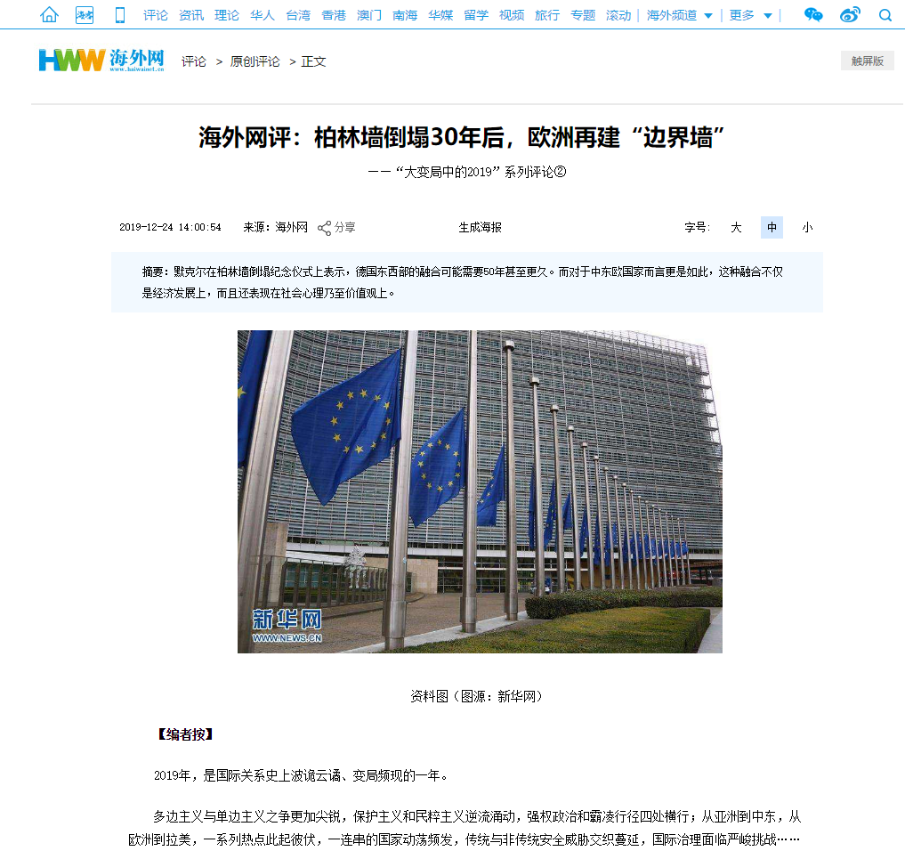 bv伟德王明进副经理作为海外网特约评论员发表文章,题目是《柏林墙倒塌30年后,欧洲再建“边界墙”》。该文是海外网推出的年终系列国际评论,“回望‘大变局中的2019’”的第2篇。海外网致力于打造中国在海内外具有重要影响力的新媒体国际传播平台,第一时间向读者提供中国热点、国际时政,特别是涉华国际新闻事件的权威解读。以下是文章题头截图、摘要和文章原文地址。