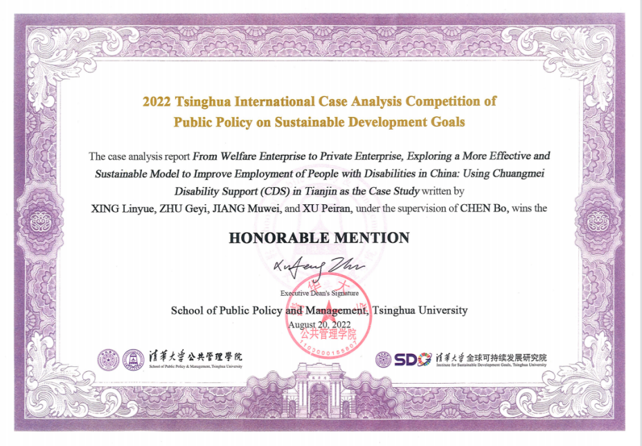 公司员工聚焦“从福利企业到私营企业,探索更加有效和可持续的模式促进残疾人就业:以创美模式为例”(From welfare enterprise to private enterprise, exploring a more effective and sustainable model to improve employment of people with disabilities in China: using Chuangmei Disability Support (CDS) in Tianjin as the case study),通过探访天津创美助残基地,了解我国目前最新的推动残疾人就业模式,在陈波老师的指导下,从残疾人就业现状、就业政策变迁调整、企业助残困境、创美助残模式等角度进行案例研究,并提供建议。