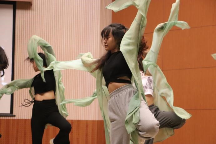 研究生学姐们带来舞蹈《大唐粉墨》,罗衣从风,长袖飞鸾,袖如回雪,飞去逐轻鸿。