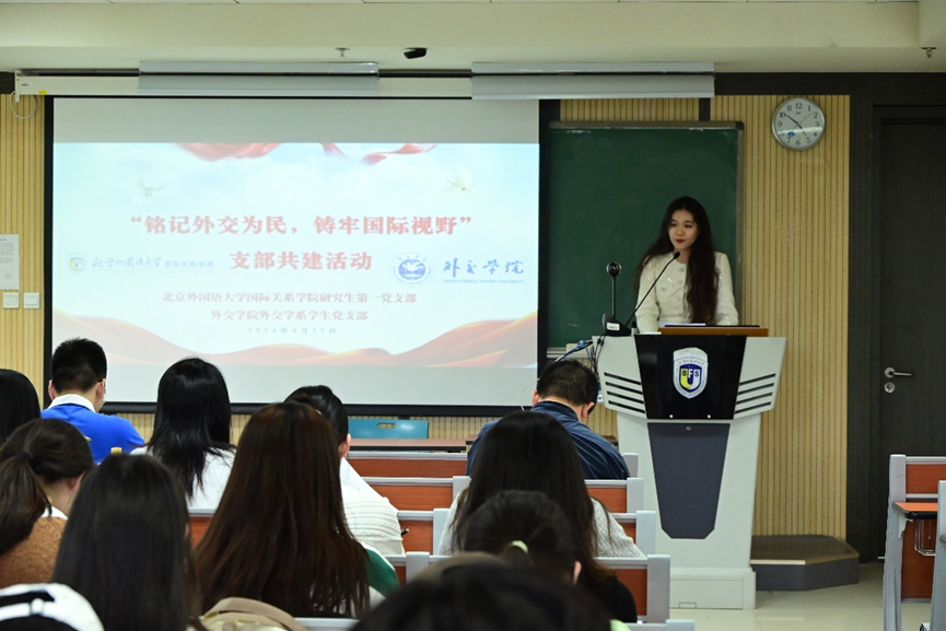 党支部书记杨孟昊介绍了我支部的相关建设情况。他充分肯定了外交公司深厚的学术底蕴、独特的校园魅力和突出的支部风采,表示在本次活动中收获良多,期望双方在未来多多开展共建活动,不断加深彼此情谊。