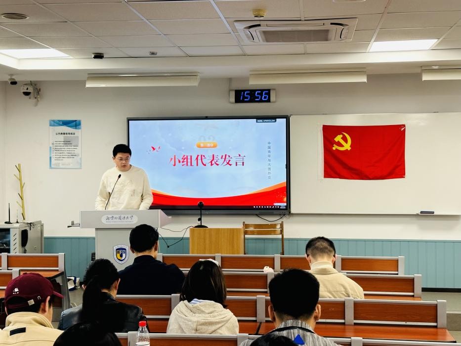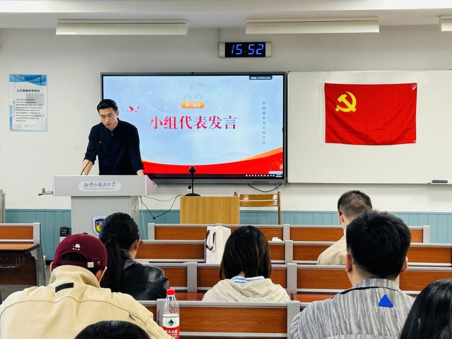 讨论结束后,每个小组选派一名代表进行总结发言。第一小组代表为入党积极分子朱晓雨,她提出中国高度重视性别平等以及女性权益等议题,并以各类实际举措促进性别平等进程;第二小组代表为发展对象于鑫洋,他立足于自身研究方向并结合小组讨论内容提出中国青年应当在“一带一路”建设中不断发力;第三组代表为预备党员李彦德,该组认为中国青年应当更加关注和平发展的议题,关注身边的时事,做一个有心的青年人,以热情代替冷漠。